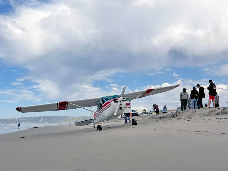 A Cessna made an emergency landing at Mission Beach on Tuesday. The two people onboard were not injured, officials said. (K.C. Alfred / The San Diego Union-Tribune)